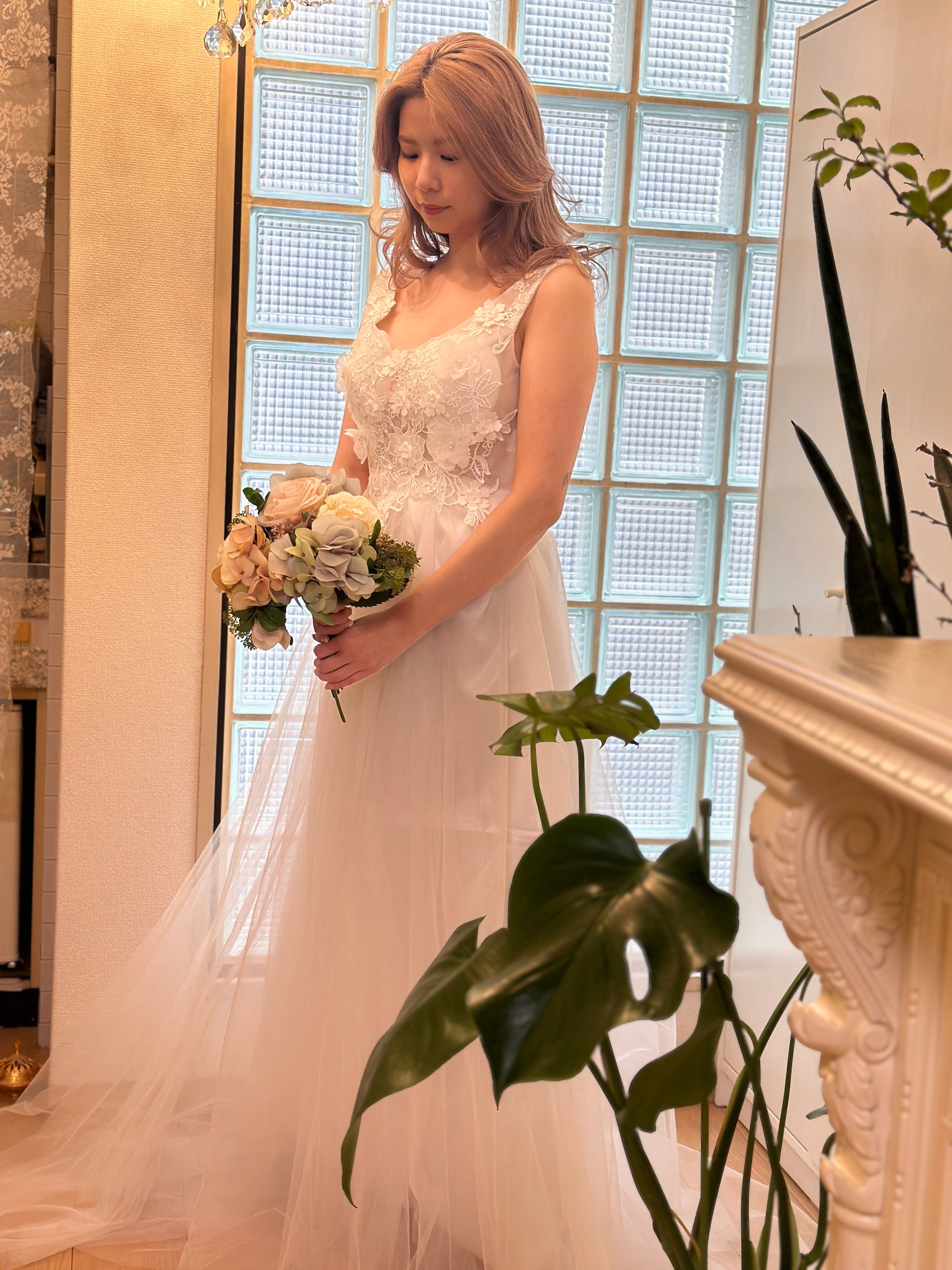 立体感あるレースとチュールのスカートの組み合わせが可愛いカジュアルドレス。